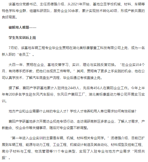 【湖北日报】襄阳产学研基地瞄准汽车产业 让技术服务于企业 让学生活跃在车间