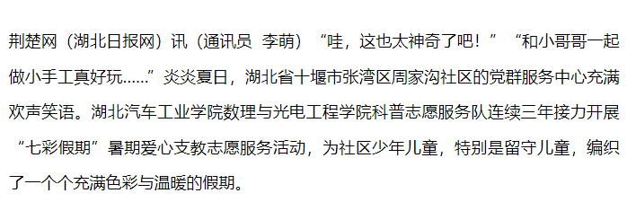 【荆楚网】湖北汽院数理与光电工程学院科普志愿服务队:三年爱心接力 筑梦七彩假期