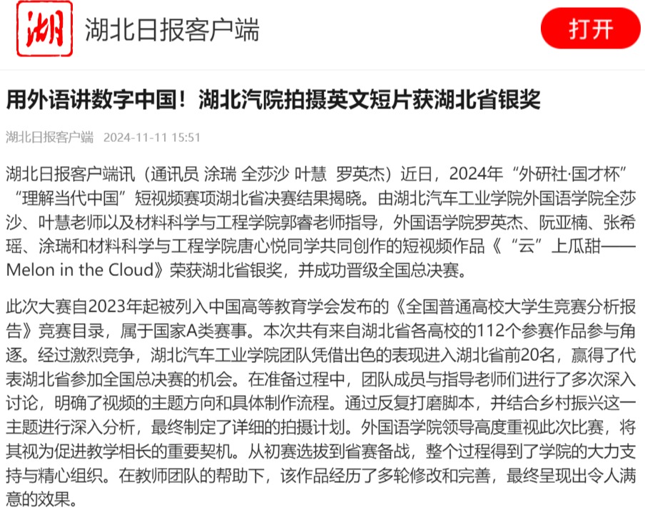 【湖北日报】用外语讲数字中国!湖北汽院拍摄英文短片获湖北省银奖