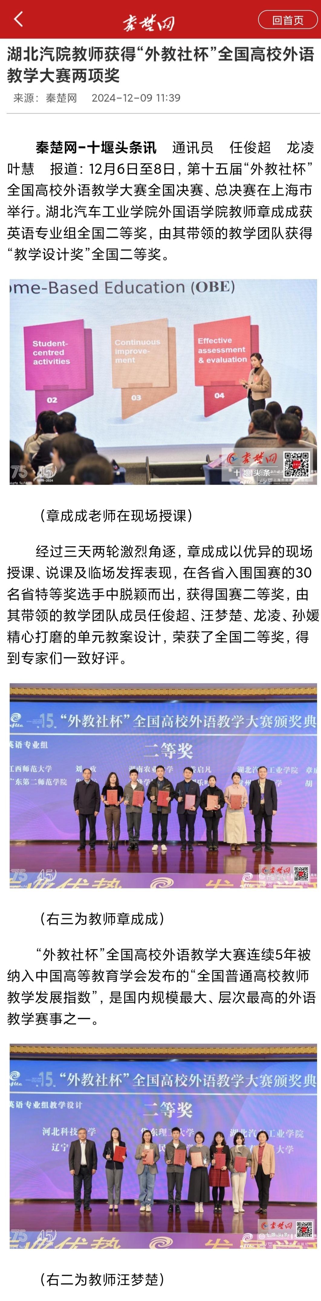 【秦楚网】湖北汽院教师获得“外教社杯”全国高校外语教学大赛两项奖